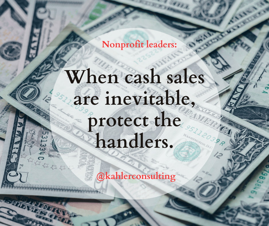 Tip #6: When cash sales are inevitable and tracking isn’t an option, limit your cash handlers. When I was Executive Officer for a youth sports league, we protected our volunteers by only having people covered by our officer and director insurance working the admission gates. Those people were often sitting alone all day with lots of cash in a box. Other league officers picked up excess cash frequently but we also made sure they were covered by insurance in case something happened.