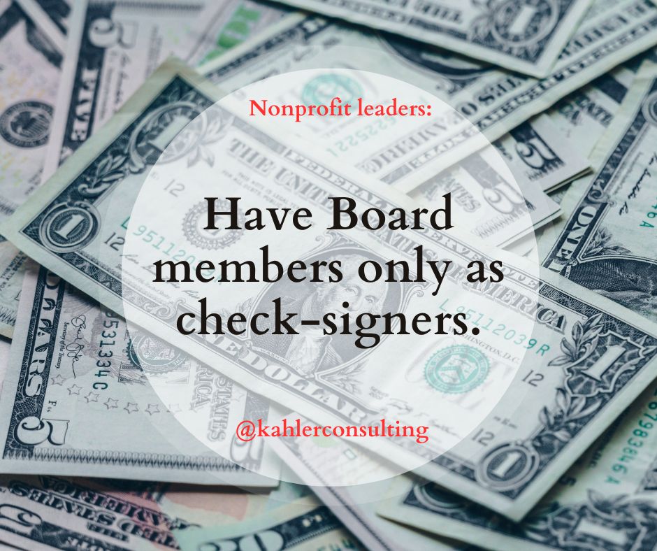 Tip #3: As the paid head of a nonprofit, don’t be a signer on the bank account. Now I admit this is often terribly inconvenient, especially if your treasurer isn’t readily available. Once we had our treasurer quit and no one could sign the employee paychecks. But I’d rather get a paycheck late than be a signer. This policy protects both staff and the organization. I saw a local nonprofit in the news that allowed their director to sign checks. She embezzled hundreds of thousands of dollars before she got caught. Even though she’s now in jail, the organization still lost community trust (and therefore donations) because of it. No one wants to give to an organization where the board doesn’t notice theft.