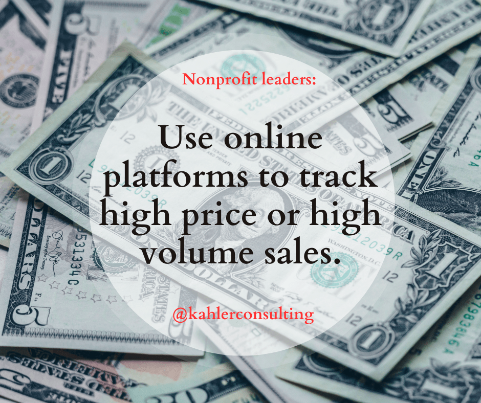 Tip #5: Use platforms like Eventbrite.com or charityauctionstoday.com to track higher price or high volume sales. This makes it all clear and easy for accounting to track money in and out. The transaction fee you pay is well worth the credibility it lends to your nonprofit.