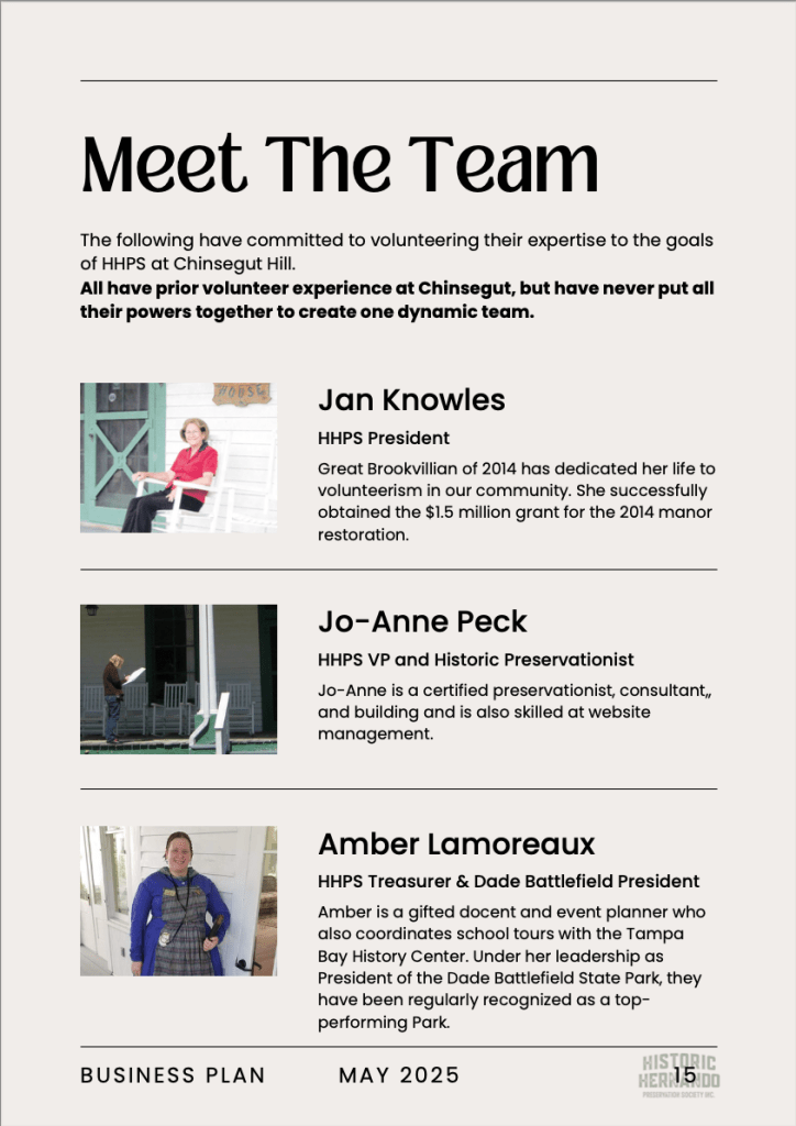 Dr. Meindl is one of the 15 member team who has agreed to come alongside Historic Hernando Preservation Society (HHPS) in their proposal to manage Chinsegut grounds. Why did these 15 people form a plan? Because in the April BOCC meeting, Commissioners asked the public for potential alternatives for managing the site. HHPS board members decided to combine forces to see if they could create a viable plan. They asked others who’d interceded on Chinsegut’s behalf if they wanted to join their efforts. Everyone said yes and began holding weekly meetings to devise the plan.