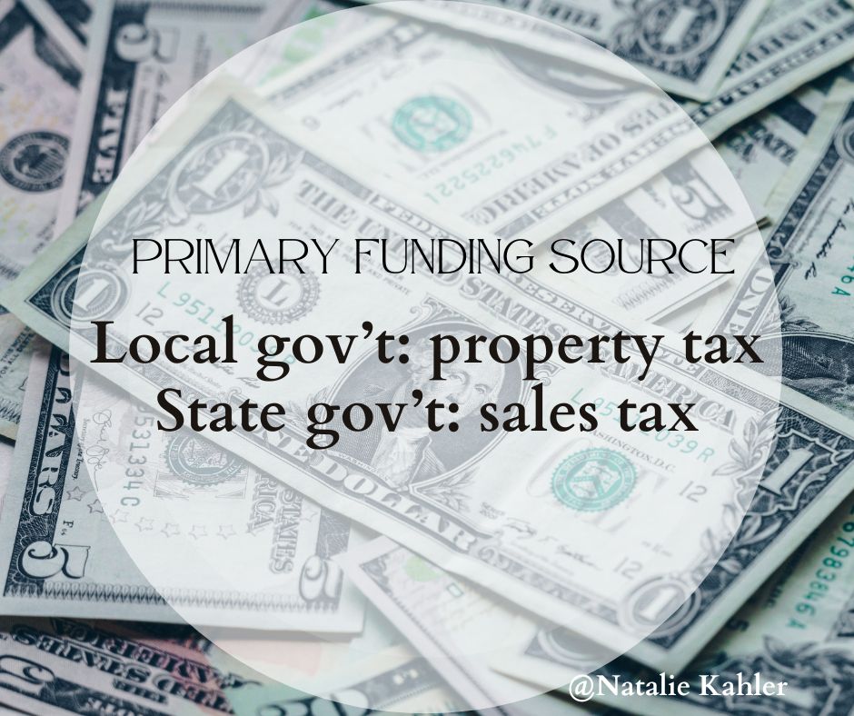 Local governments (aka counties and cities) provide for law enforcement, fire departments, water accessibility, garbage pickup, local roads and infrastructure, parks and libraries. (There’s more but you get the idea. Basic stuff that impacts your life daily). In the current system they are primarily funded by property taxes. By contrast, the State Government is primarily funded by sales tax.